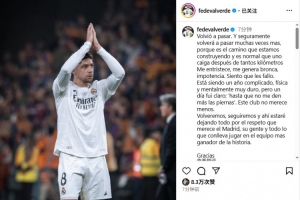 体育资讯4月27日讯 皇马中场巴尔韦德今天在Instagram发文,鼓励球队。